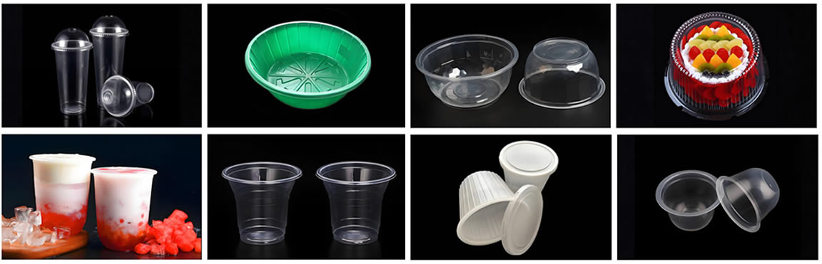It is suitable for processing different materials, such as A-PET, R-PET, C-PET, BOPS, HIPS, PP, PLA, PVC and barrier materials, and is suitable for the production of various beverage cups, coffee cups, milk cups, water cups, bowls, boxes and other plastic products.