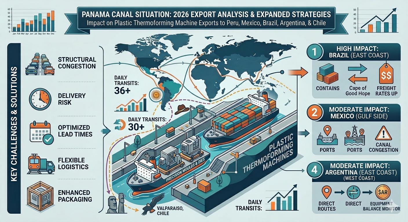 As global manufacturing trade continues to deepen in March 2026, the American markets—specifically Peru, Mexico, and Brazil—have shown robust growth in demand for our specialized equipment. However, the Panama Canal, the strategic bottleneck connecting the Pacific and Atlantic Oceans, is experiencing fluctuations in capacity and transit policies. For a manufacturer of high-precision, large-scale plastic thermoforming machines, analyzing these shifts is essential to safeguarding our export delivery and supply chain resilience.