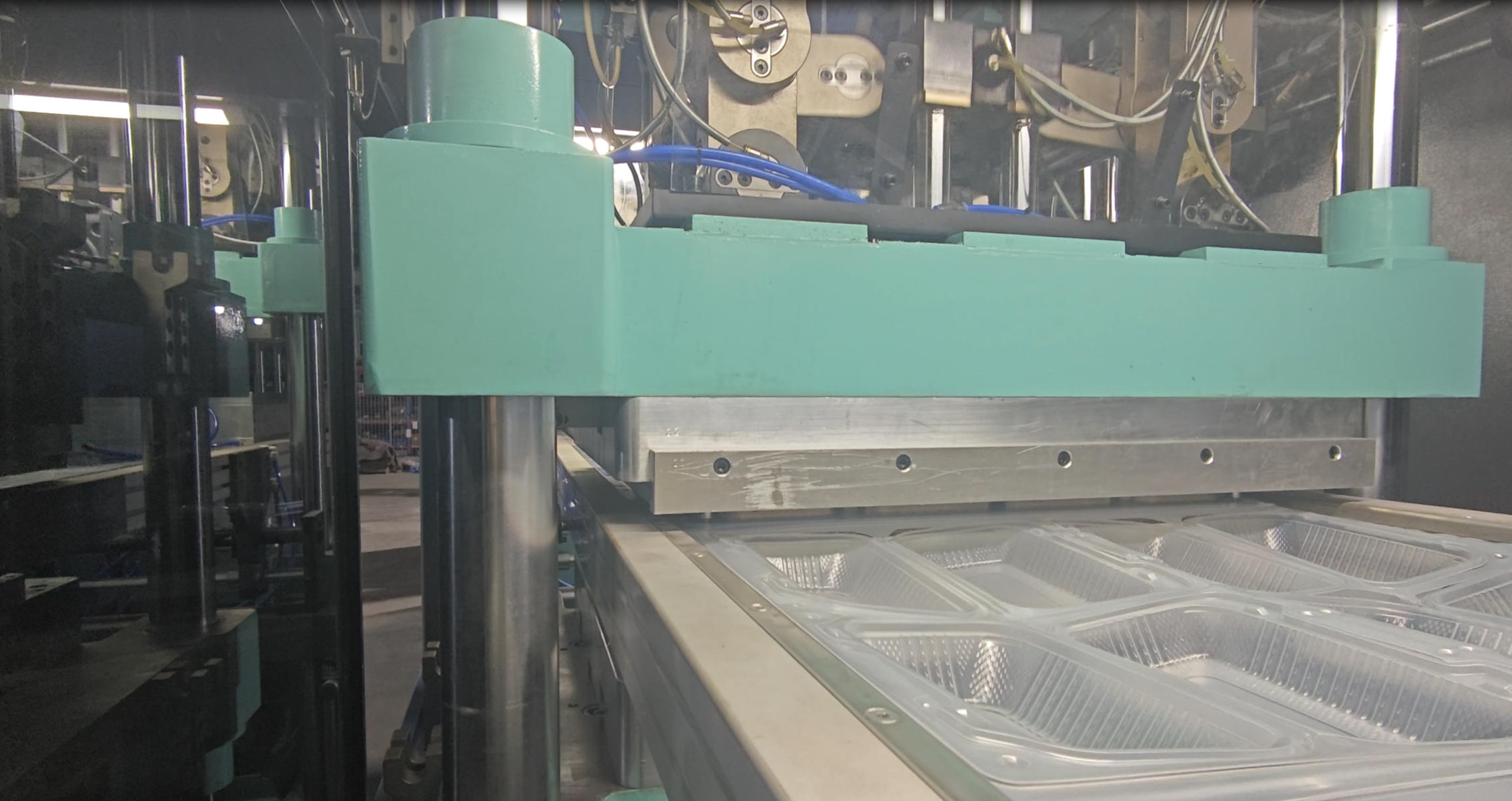 This design, paired with a four-column support structure, provides the mechanical rigidity needed for rapid mold opening and closing. Whether processing BOPS or HIPS, this system minimizes vibration and wear, even at speeds up to 45 molds per minute.
